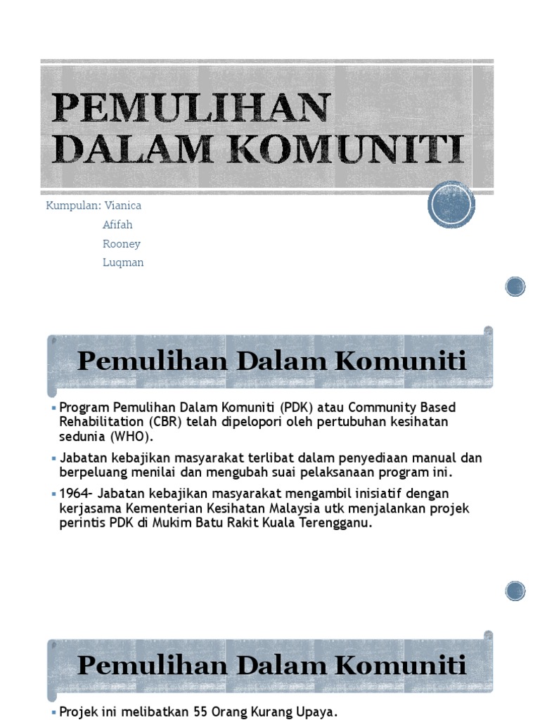 Program PDK merupakan satu strategi pembangunan komuniti dalam rehabilitasi OKU penyamaan peluang dan integrasi sosial OKU. Universiti Malaysia Sarawak UNIMAS Program. Program Pemulihan dalam Komuniti PDK atau Community based Rehabilitation CBR telah diperkenalkan oleh Pertubuhan Kesihatan Dunia WHO dan dimulakan di Malaysia oleh WHO sejak tahun 1980-an.
